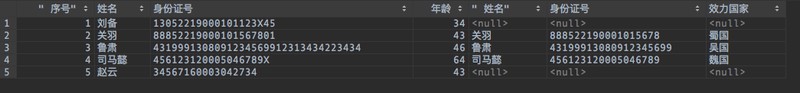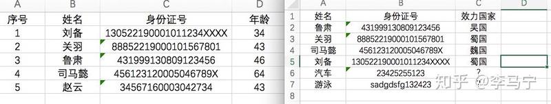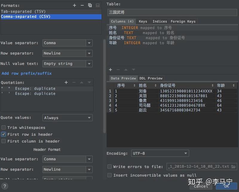 DataGrip这个零件实际在Pycharm和Idea中都有,就是从里面分离出来的专门处理数据库的零件,用这两个软件也可以实现以下操作。Sqlite属轻量级数据库,几万数据量用它应该足够了,而且内嵌在python中,即使以后用来做flask的数据库也是绰绰有余。我想要实现的是,一个表是武将的名单和身份证号,另一个表是武将的身份证号和效力国家,最终要导出的是武将的信息以及效力国家,且以武将名单为准。相应csv数据如图,如果修改的话,建议先新建excel文件,再打开csv,这样身份证号的科学计数法就可以被忽略,再另存为csv,utf-8编码。