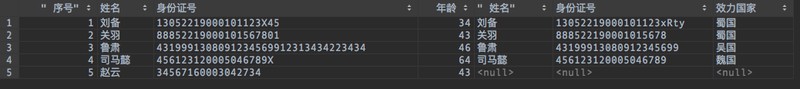 *代表所有列,left join是左连接,on后面是条件,后面条件的意思是两列身份证号的前18位要对应。