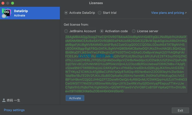 再次打开IDE,选择Activation Code,添加专属永久激活码,根据自己的IDE选择对应激活码,这里复制DataGrip激活码(全部复制):