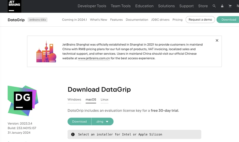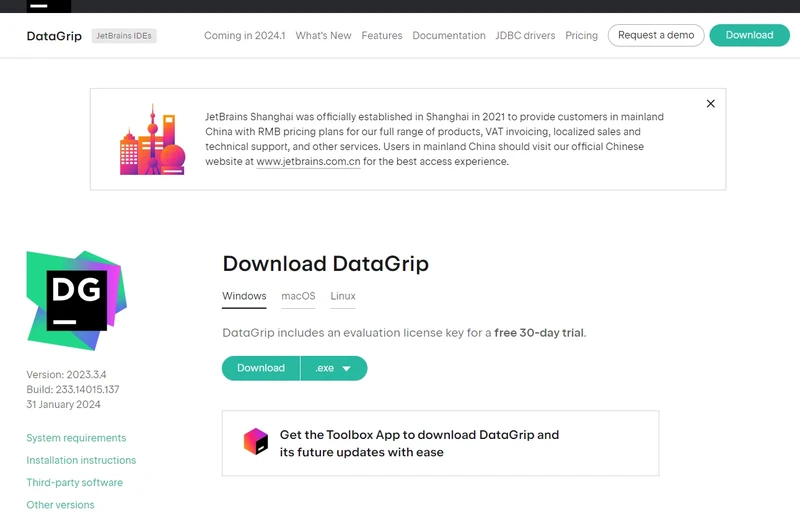 1.先去IDE官方下载你需要的软件,这里以DataGrip为例,因为此方式适用于所有全家桶激活。这里以最新版2023.3.4为例,此方式适用于所有版本,并支持新版。