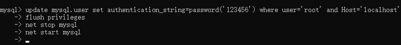 update mysql.user set authentication_string=password('') where user='root' and Host='localhost'