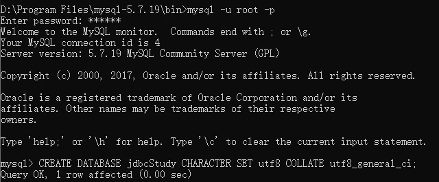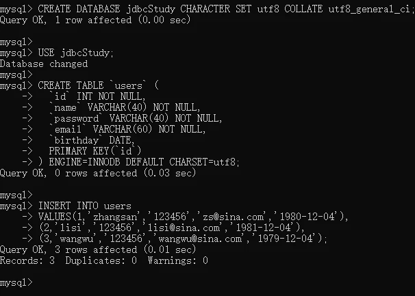 CREATE DATABASE jdbcStudy CHARACTER SET utf8 COLLATE utf8_general_ci;