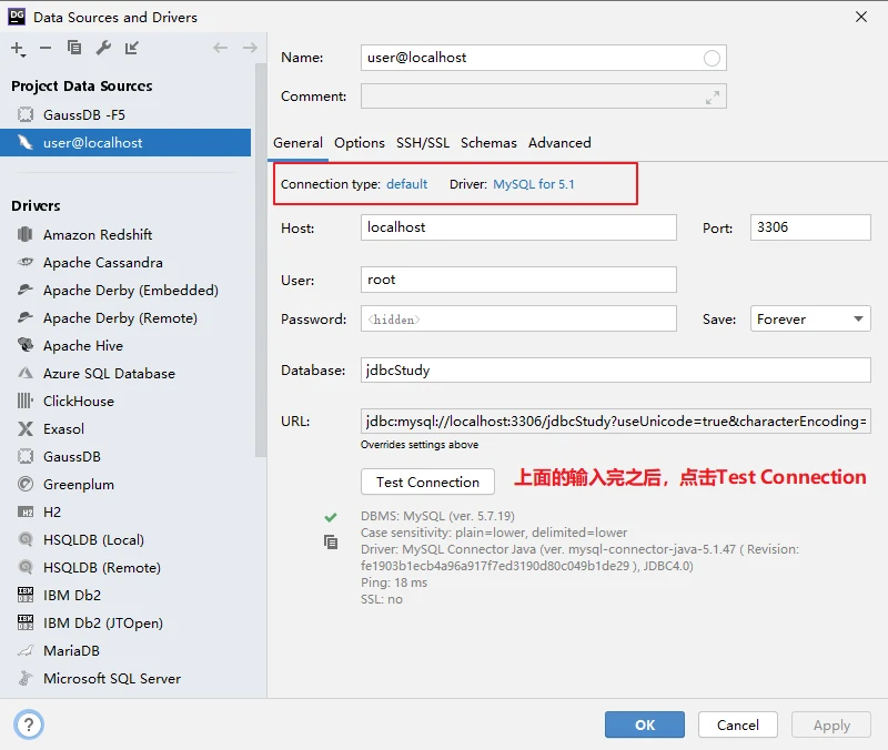 这里的jar包的版本和MySQL的版本没有必要一致。我的MySQL是mysql-5.7.19,数据库驱动jar包是mysql-connector-java-5.1.47.jar