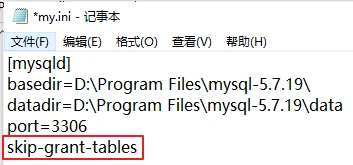 1.把my.ini中的原来注释掉的skip-grant-tables再重新开启,即把#去掉