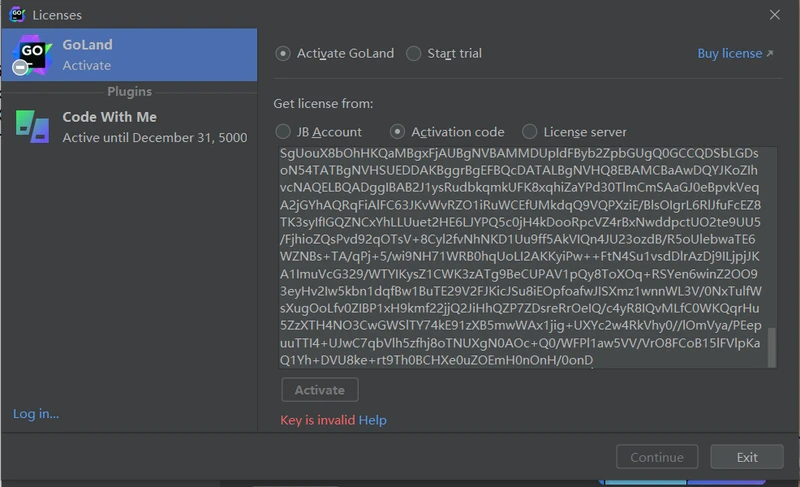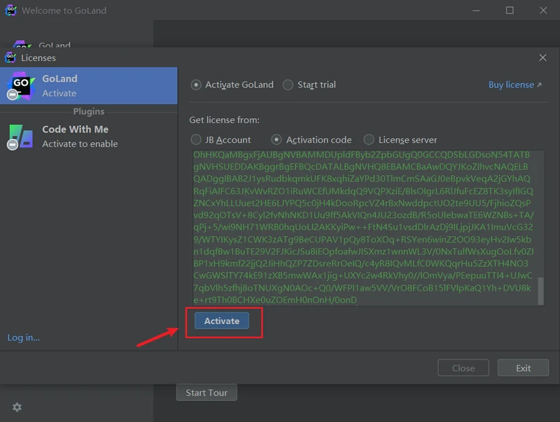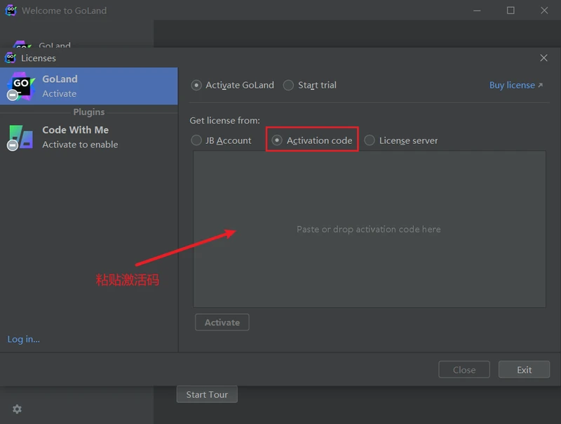 6、然后我们打开 GoLand,如下图所示点击 Activation code ,并将下方激活码粘贴至下框中