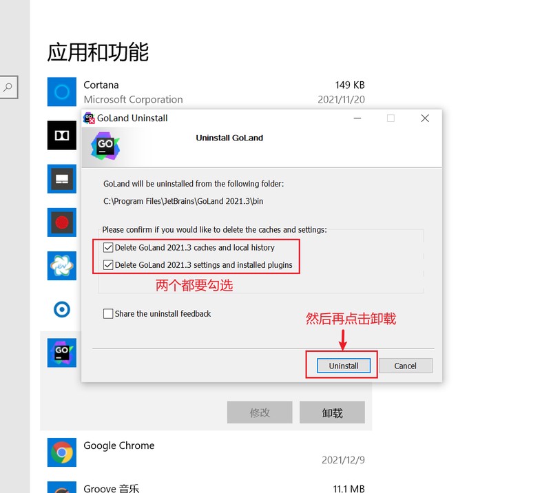 1、为了确保一次性激活成功,我建议大家将电脑上原有的 GoLand 卸载并且按照下面的步骤删除旧文件(Ps:如果你的电脑是第一次安装 GoLand,可以忽略这一步。)在卸载 GoLand 的时候,图片所示的两个选项要勾选。