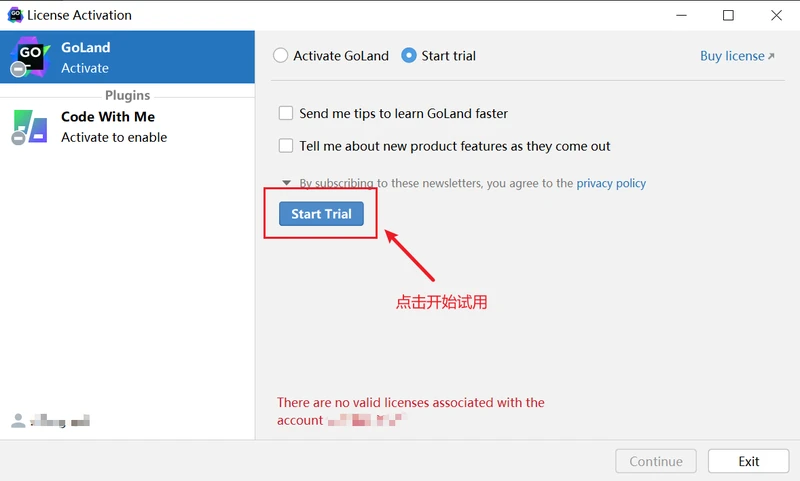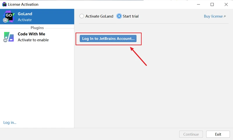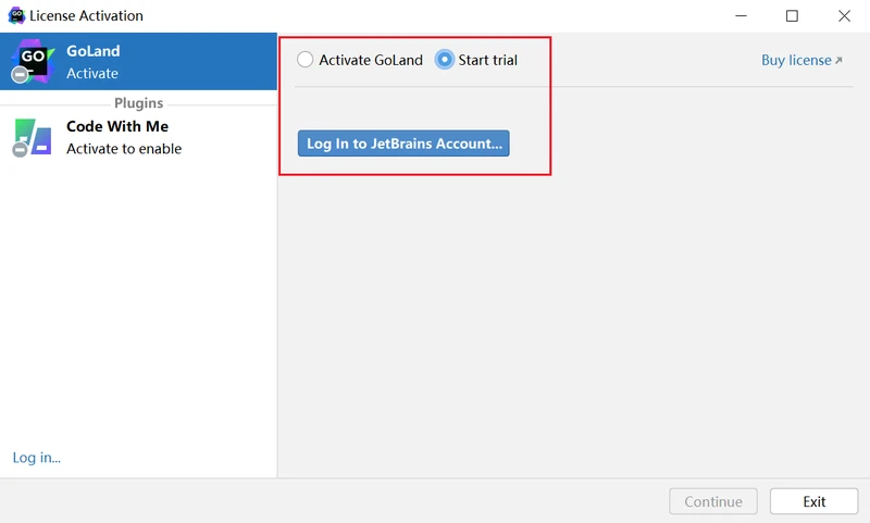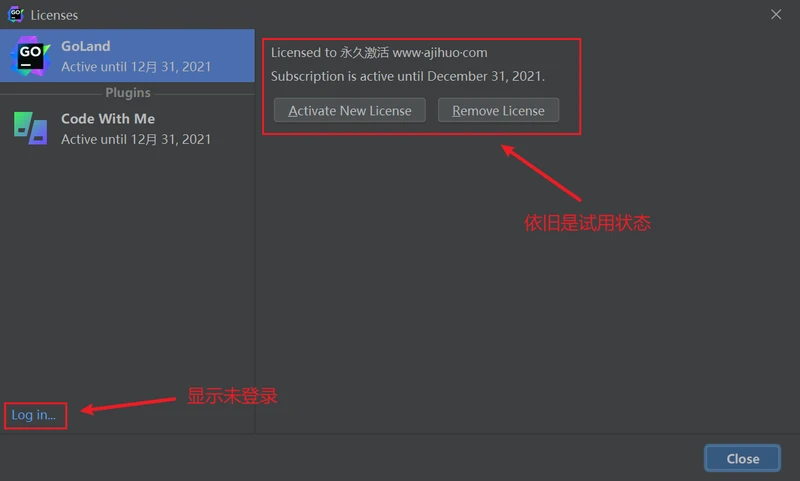 重启之后,我们再次点击 中的 ,会显示你并没有登录,但是 GoLand 依旧处于试用状态!