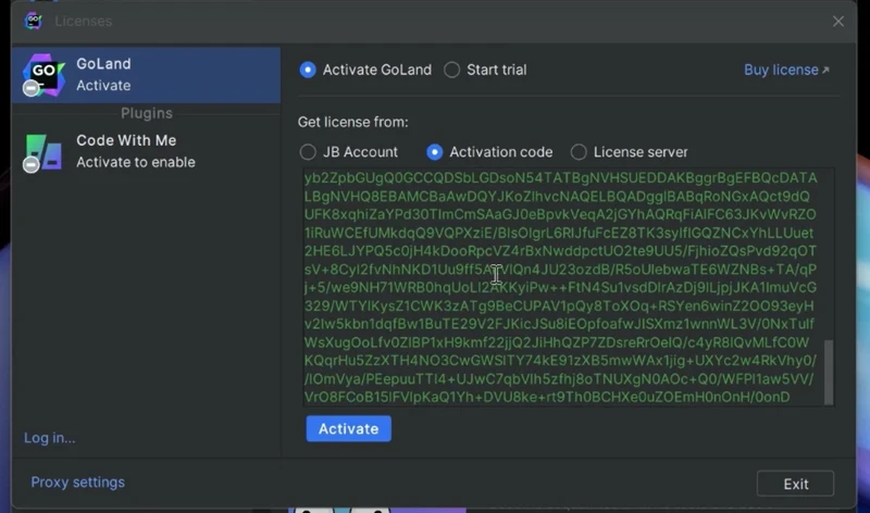 5.打开 GoLand,再将工具里提供的激活码,复制到 activate code 中,具体操作查看截图。
