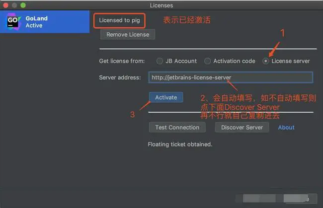 选择最后一种License server激活方式,地址填入:http://jetbrains-license-server (应该会自动填上),或者点击按钮:”Discover Server”来自动填充地址,完成激活。