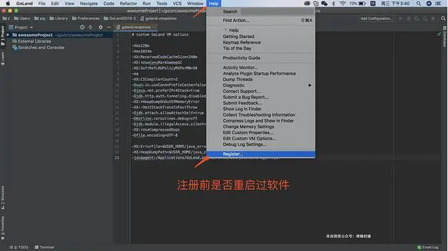 修改完配置文件之后重启GoLand,点击菜单栏中的 “Help” -》 “Register …”