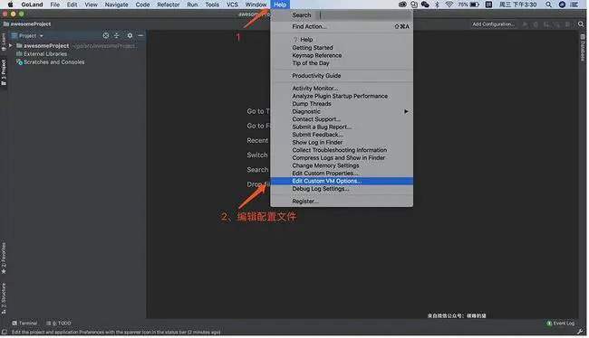 进入到项目界面后,点击GoLand最上面的菜单栏中的 “Help” -》 “Edit Custom VM Options …”。