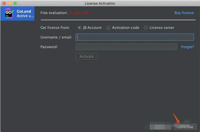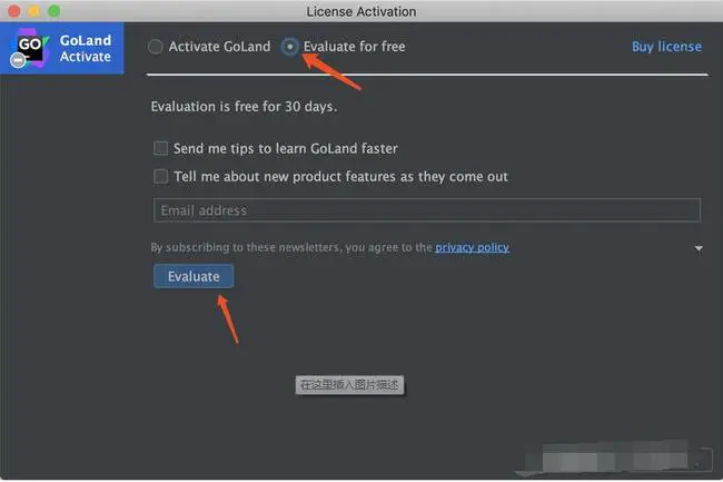 如果你是刚下载的GoLand,则需要点击激活窗口的“Evaluate for free”免费试用,然后再创建一个空项目,这样就可以进入到GoLand的工作页面