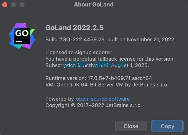 本文主要介绍Goland激活成功教程教程,目前官方最新版本为Goland2022.2.5版本,本次通过工具永久激活成功,需要的小伙伴按教程操作即可成功激活,激活工具在文末附件中免费下载。如果第一次操作完激活失败,提示:“Key is invalid”,可以看文章最后的解决方法。