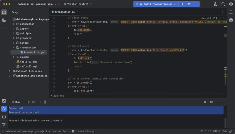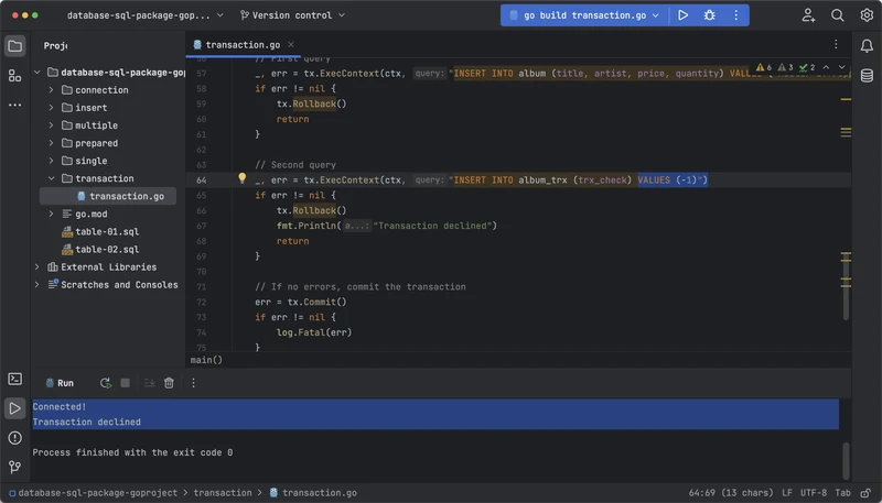 该结构类似于本教程中讨论的结构,除了最后一部分,它包含 2 个查询。 根据文档,您可以使用代表事务的 sql.Tx 执行数据库事务。