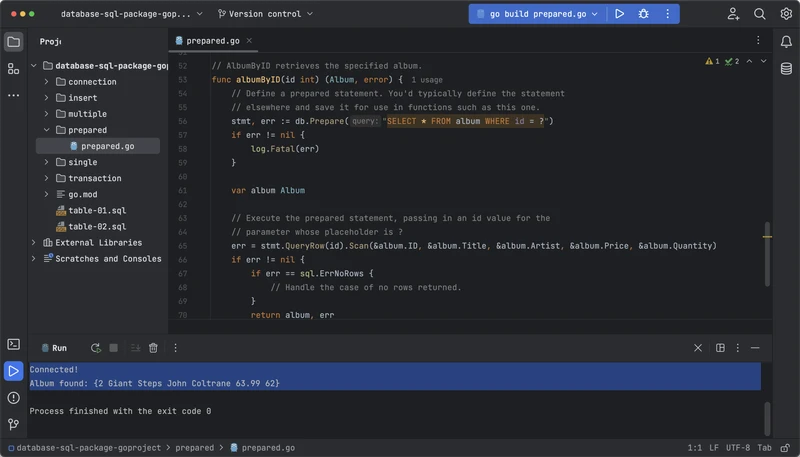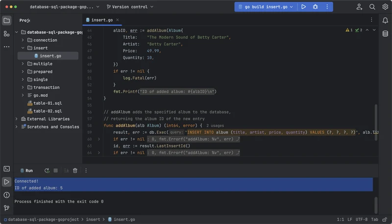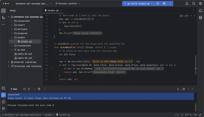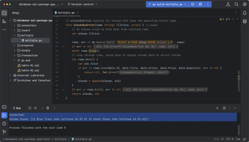 本教程解释了如何实现 软件包以在 Go 中访问数据库、执行不同类型的查询、插入数据,以及执行事务。 此外,我们还简要回顾了 Go 中的错误处理。 在教程中,您已经了解到 GoLand 在编写和运行代码方面有多么方便。 您可以在这里详细了解 JetBrains 为开发者提供的工具。