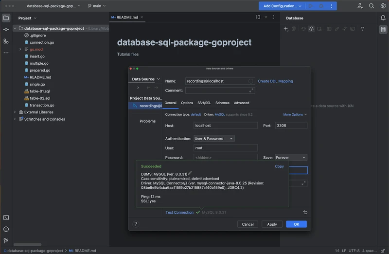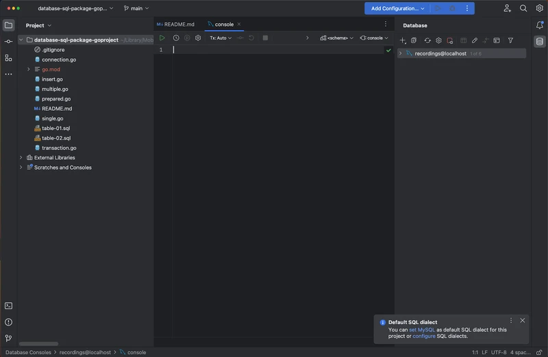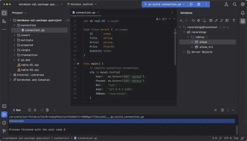 至此,您已经将 GoLand 配置为与本地 MySQL 服务关联,因此,您可以使用 SQL 脚本轻松创建和预填充表。 同样,在下一部分中,您将了解在 GoLand 中使用 软件包有多轻松。