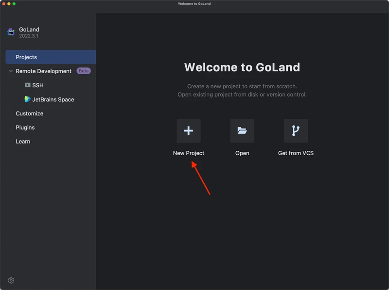 第一步是在 GoLand 中创建新项目。 为此,在 Welcome(欢迎)屏幕上按 New Project(新建项目)按钮。