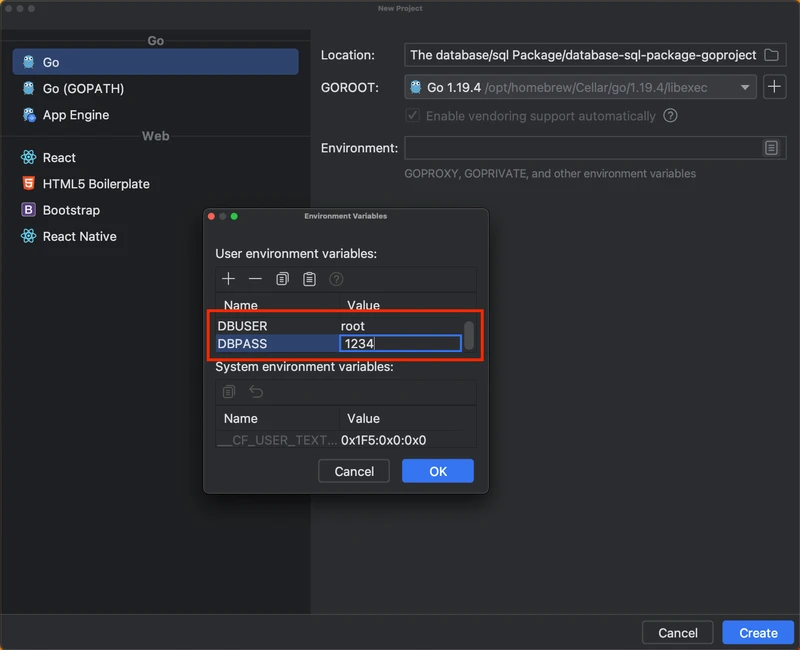 Environment(环境)。 这是一个可选字段,允许您声明环境变量,例如 GOPROXY 或 GOPRIVATE。 在本教程中,您将使用此字段声明后续连接数据库所需的 MySQL 环境变量 和 。 为此,您必须输入相应的键值对,如下所示。
