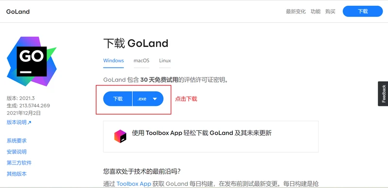 然后我们再从 GoLand 官网下载最新版本的 GoLand,点击跳转官网下载