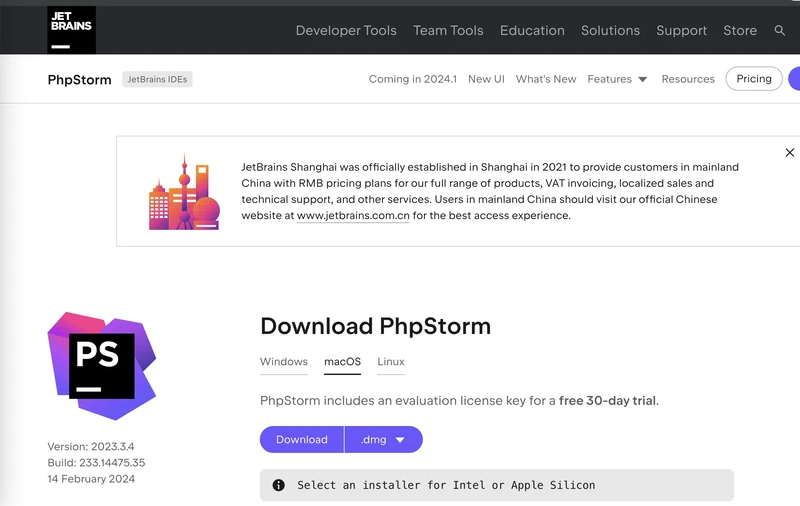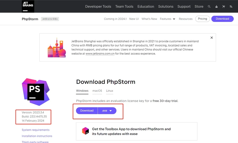 1.先去IDE官方下载你需要的软件,这里以PhpStorm为例,因为此方式适用于所有全家桶激活。这里以最新版2023.3.4为例,此方式适用于所有版本,并支持新版。
