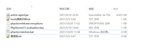 二、还是看看我们需要准备的东西!只用关心后三个就行,phpstormActive.bat , hosts修改示例.txt 以及 激活码.txt!