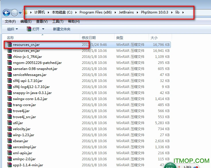10、最后将复制好了的PhpStorm10汉化包中的“resources_cn.jar”文件复制回C:Program Files (x86)JetBrainsPhpStorm 10.0.3lib目录(注意这是默认的安装目录),完毕!