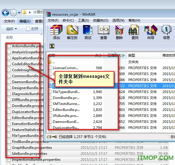 双击打开resources_cn.jar(注意是打开而不是解压出来),将下载的汉化包zh_CN目录下的所有文件拖到刚才打开的resources_cn.jar文件内的messages目录中,并保存