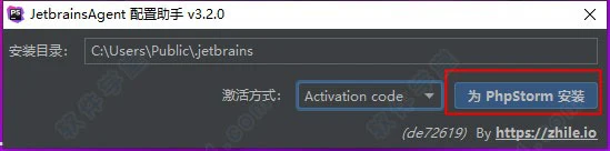 4、软件打开之后,弹出激活方式,首先选择activation code,然后点击为PhpStorm安装,最后点击是重启软件