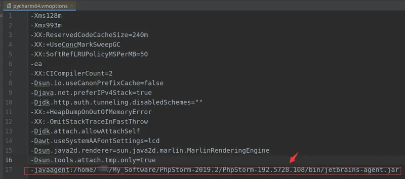 3.在打开的vmoptions编辑窗口末行添加:-javaagent:/absolute/path/to/jetbrains-agent.jar