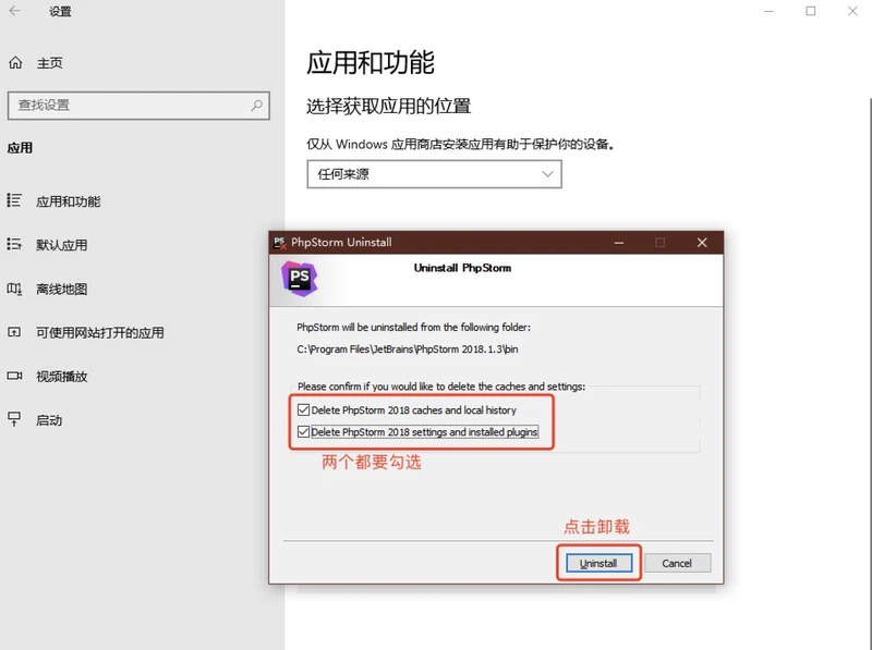 1、为了确保一次性激活成功,我建议大家将电脑上原有的 PhpStorm 卸载并且按照下面的步骤删除旧文件(Ps:如果你的电脑是第一次安装 PhpStorm,可以忽略这一步。)在卸载 PhpStorm 的时候,图片所示的两个选项要勾选。