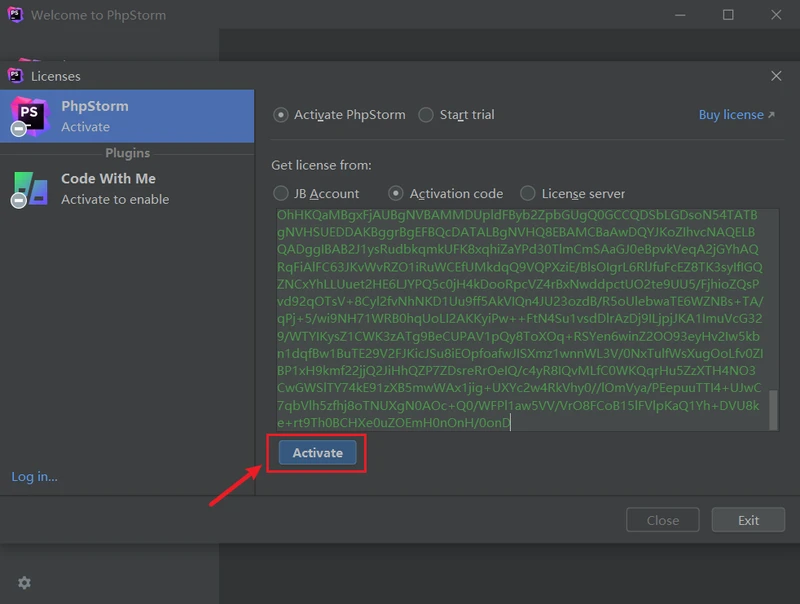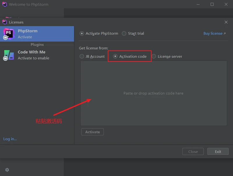 6、然后我们打开 PhpStorm,如下图所示点击 Activation code ,并将下方激活码粘贴至下框中
