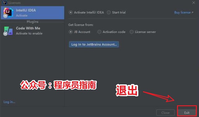 IDEA 运行成功后,会弹出下面的对话框,提示我们需要先登录 JetBrains 账户才能使用,这个时候不要管,直接点击Exit 退出。