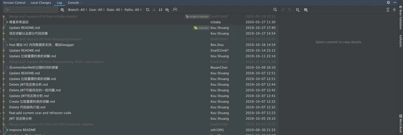 如下图示,这个是 IDEA 自带的版本控制功能,非常好用,清晰地展示了提交记录,便于查阅别人的提交以及项目组进行 Code Review。