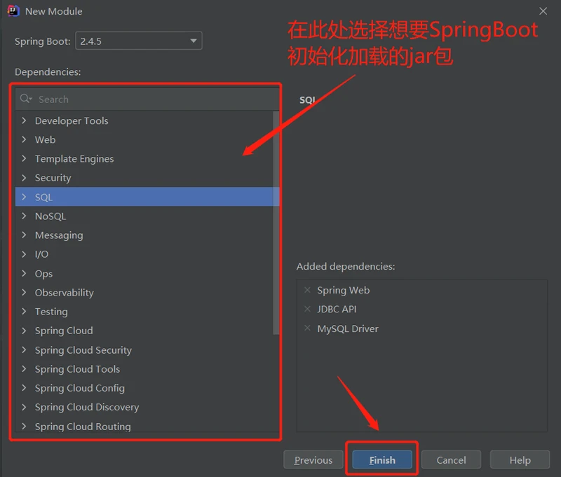 8、在这里,我们选择需要 SpringBoot 初始化加载的 jar 包,然后点击 Finish。