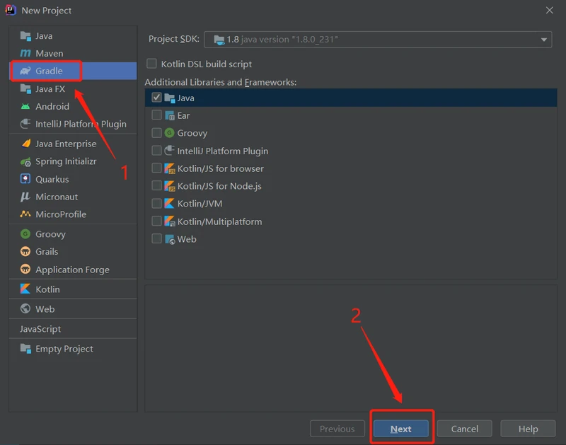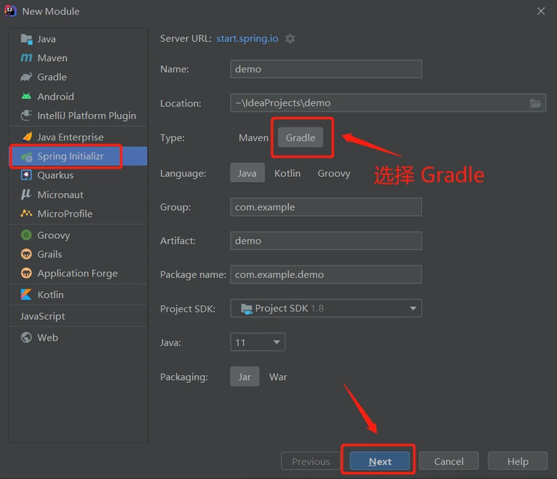 2、然后在左侧选择 Gradle ,然后点击下面的 Next。
