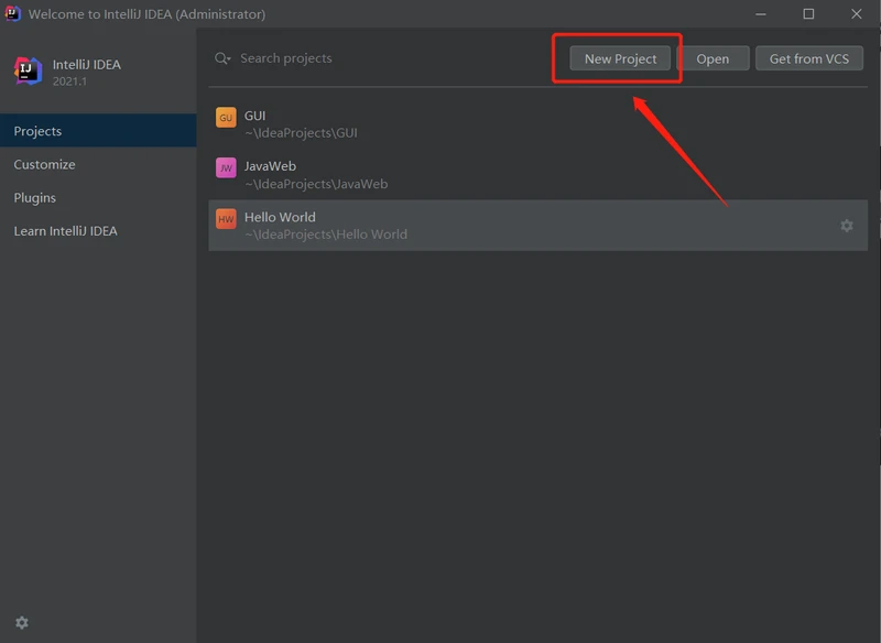 1、首先打开 IDEA,点击右上角的 New Project。