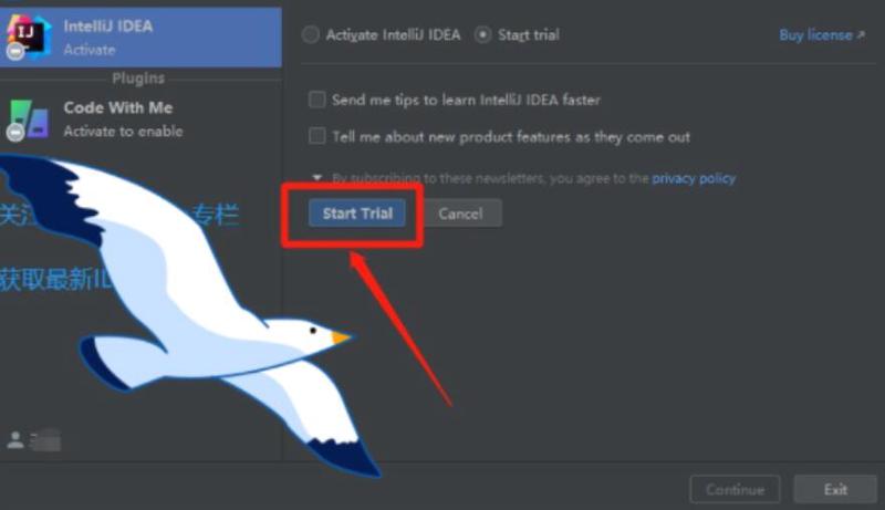 这个时候回到IDEA界面,点击 Start Trial,开始使用即可,上面的两个选项不用勾选(这种方法可以试用一个月)