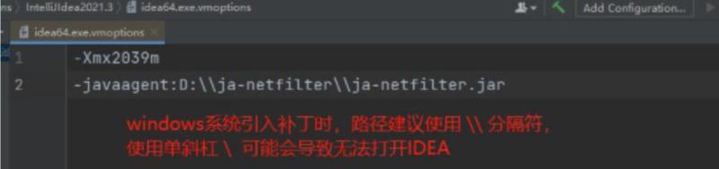 将下载的文件中的ja-netfilter的路径配置到上面的vmoptions中。(这一步一定要反复检查路径是否正确,否则会导致打不开,如果你真的打不开了,请看文末解决办法)