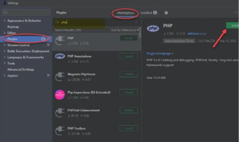 在搜索框中输入 PHP,然后单击左侧的 Install 进行安装就可以了。