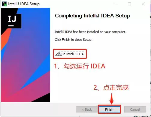 5.安装完成后,勾选 Run IntelliJ IDEA,点击 Finish 运行软件: