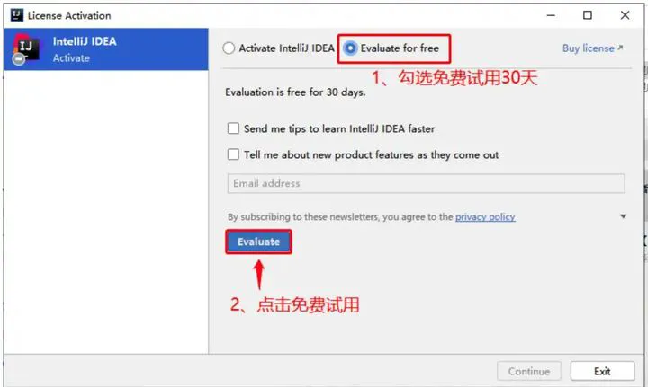 6.等待 IDEA 2021.1.2 运行, 中间会先弹出一个注册框,我们勾选 Evaluate for free, 点击 Evaluate, 先试用30天:
