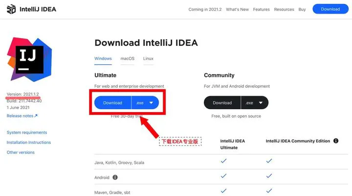 我们先从 IDEA 官网下载 IDEA 2021.1.2 版本的安装包,下载链接如下: