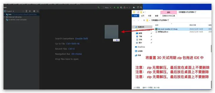 7.进入 IDEA 中, 先随便新建个 Java 工程, 然后将网盘中最新的 IDEA 无限重置 30 天试用期补丁 ide-eval-resetter-2.1.6.zip拖入 IDEA 界面中,如下图所示: