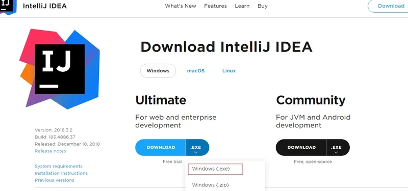 这里下载Ultimate版本,Community社区版删减很多东西,不推荐。(本人刚开始安装Community版本,Spring-Boot yml配置文件始终无法正常显示使用,浪费大量时间查找原因,配置。后来不得已改为旗舰版,问题解决)