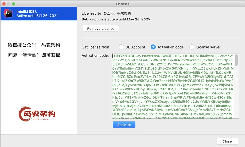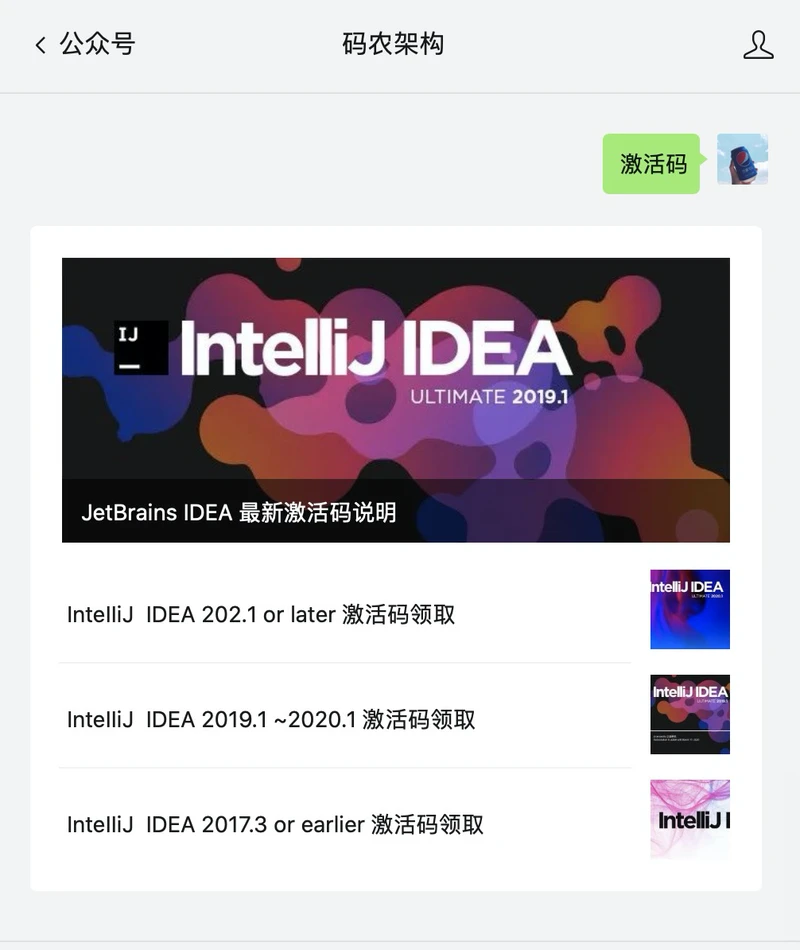 关注微信公众号:码农架构,回复‘激活码’ 即可领取最近激活成功教程激活码~