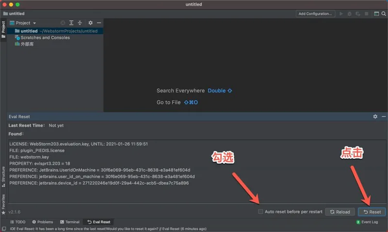 勾选项:Auto reset before per restart 如果勾选了,则自勾选后每次重启/退出IDE时会自动重置试用信息,你无需做额外的事情。(此为自动重置方式)