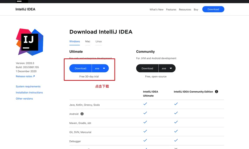 我们先从 IDEA 官网下载 IDEA 2020.3.1 版本的安装包,下载链接如下: