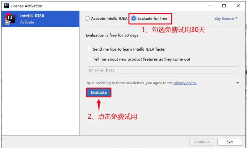 6.等待 IDEA 2020.3.1 运行, 中间会先弹出一个注册框,我们勾选 , 点击 , 先试用30天: