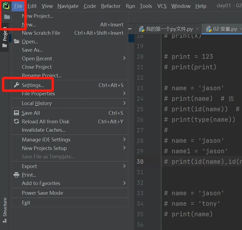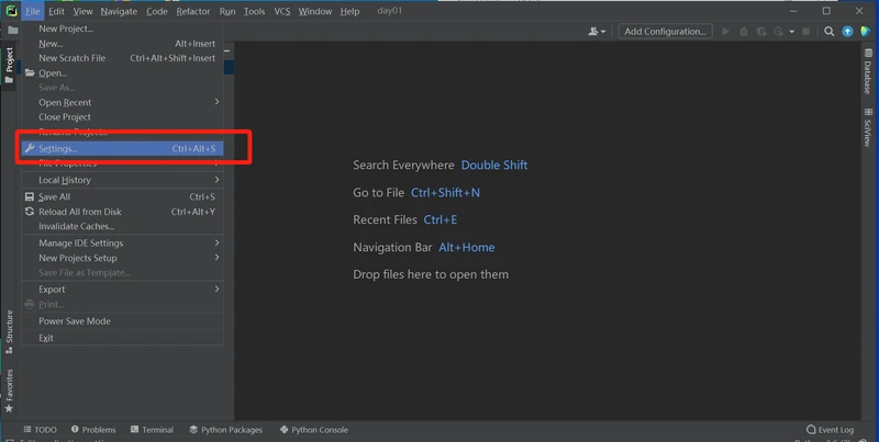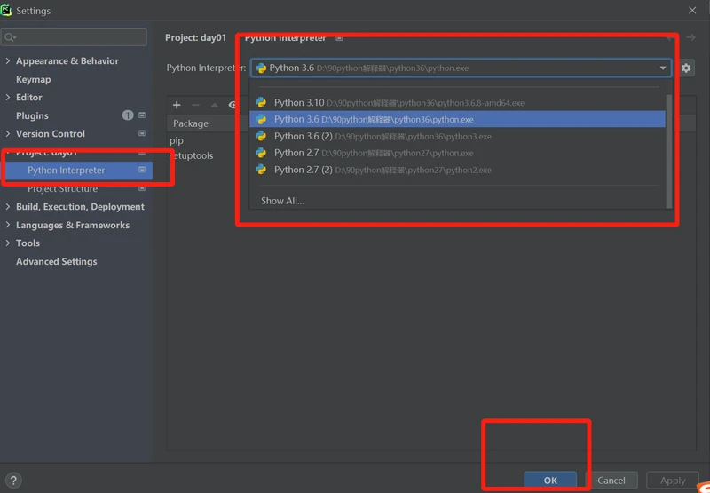 方式如下:菜单File-Settings-Project:day 01-Python Interpreter-OK.