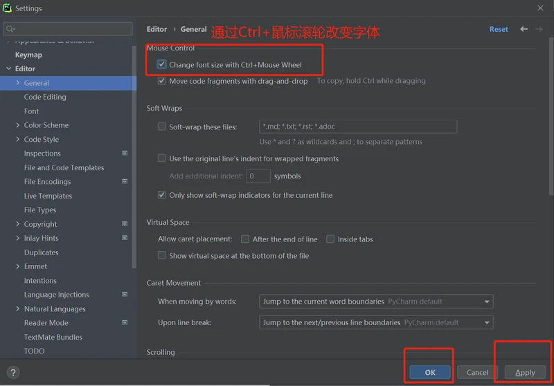 方式如下:菜单File-settings-Editor-General-勾选Change font size with ctrl+mouce wheel(通过Ctrl跟鼠标的滚轮进行调节)-OK.